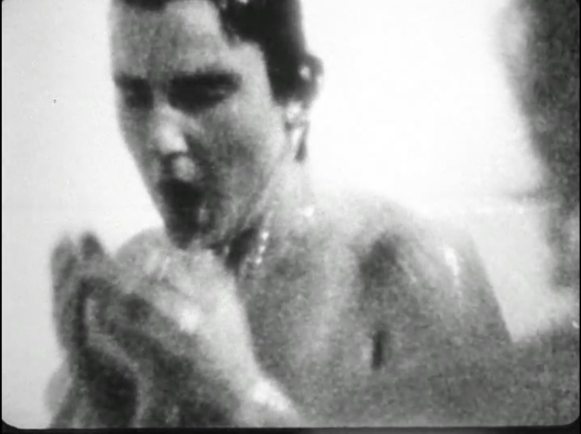 From this point forward, water becomes a mythical space of love and death. A particularly disturbing example which has clear parallels to the swimming story is that of Loss, in which the father punishes his daughters by taking to the bathtub, turning on the faucet, and shoving their faces in the water, choking them for disobeying their mother. Onscreen, we see two girls, presumably the sisters, walking amiably through what looks like a wedding scene which abruptly cuts to black once the voice over begins to describe the father’s punishment. In the section Kinship which comes directly after, the shower becomes a mythical space of ambivalence, containing death and familial trauma, but also the roiling intensity the young girl’s homosexual awakening. The sequence features two women. One is in the shower while the other is getting up from a nearby sauna. Interspersed between sequences of woman 1 in the shower and woman 2 in the sauna are travelogue-style videos of what looks to me like the desolate desert of the American Southwest, whose trying climate is relieved by a small oasis and a splash of water on a windshield. The first overtly sexual encounter between the two women is preceded by an extended shot of the ocean as two birds struggle against powerful currents. A quick cut to black. A still of the woman in the shower gasping for air (or in relief?). The other woman entering the frame to meet the open mouth with an embrace that reads as sexual but also overtly therapeutic: a necessary comforting embrace. Water as a conduit for salvation and condemnation, suffering and pleasure. There’s perhaps even a bit of reference to Hitchcock’s Psycho here. Shower sequence that portends death through two past references one filmic, one personal, but becomes a passionate love sequence, one which has the intense, almost taboo, ecstasy of forbidden homosexual desire being fulfilled, but also strikes me as akin to an understanding embrace from the future to the past.